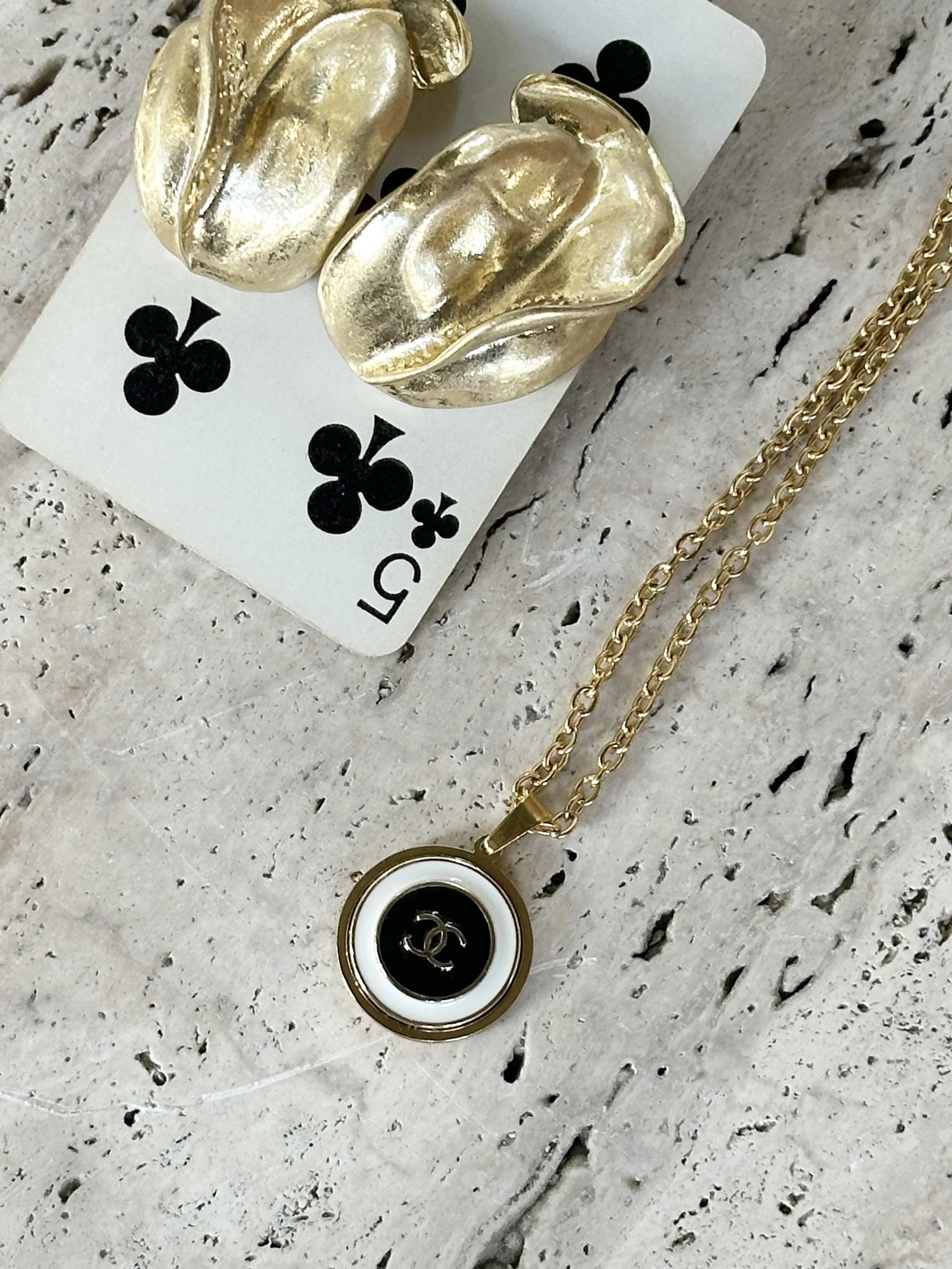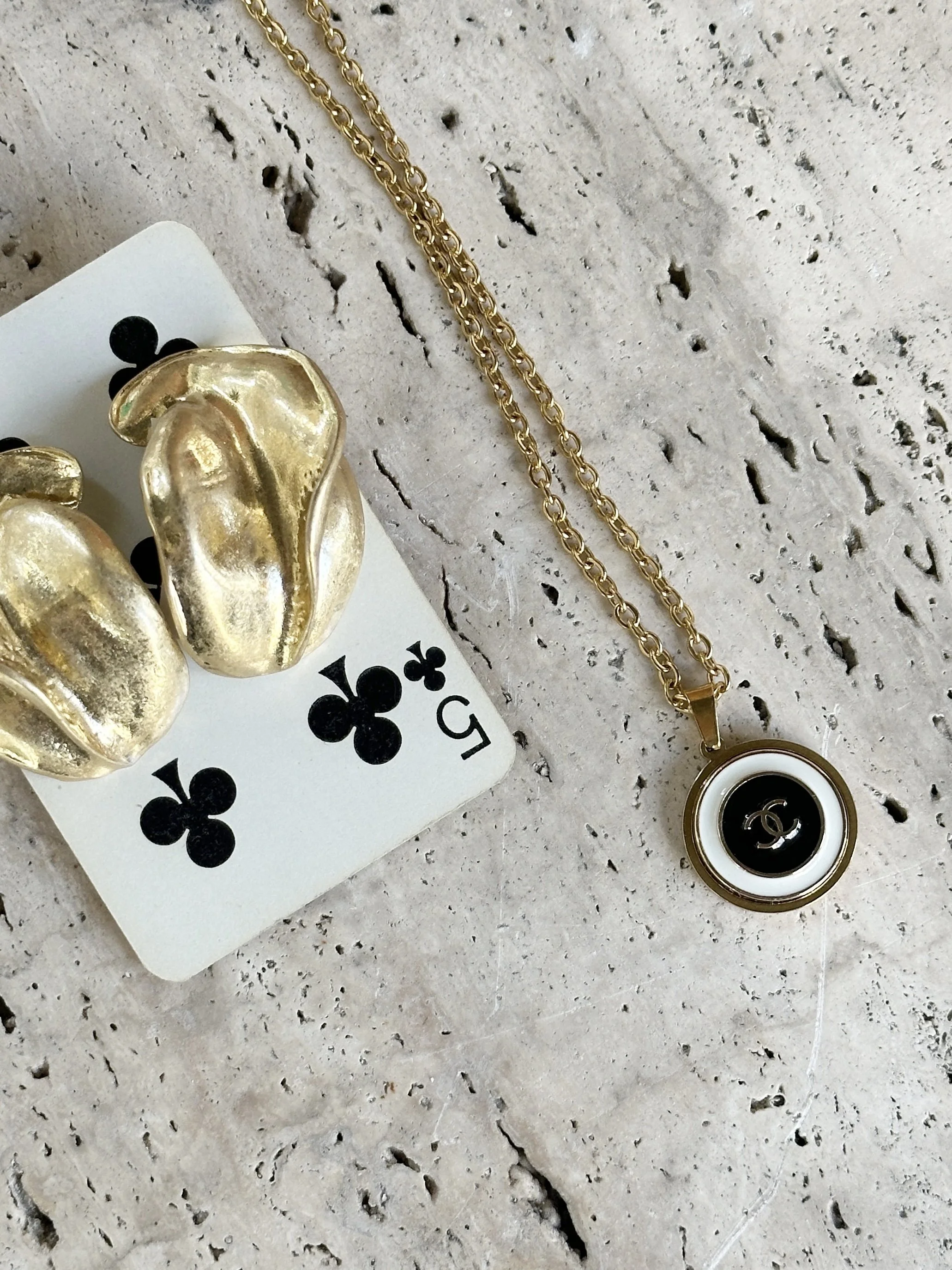 Bonjour Madame. Vi elsker dette lekre vintage smykke. Dette har vært en knapp på en Chanel bluse/ jakke- re designet til et nydelig smykke. Dette har en klassisk look & feel. Lekker sort/ hvit og gull farget knepp. Klassisk, feminint og delikat. Kjede er gull farget Nikkelfritt. Bør tas av før du dusjer. Definitv en keeper.