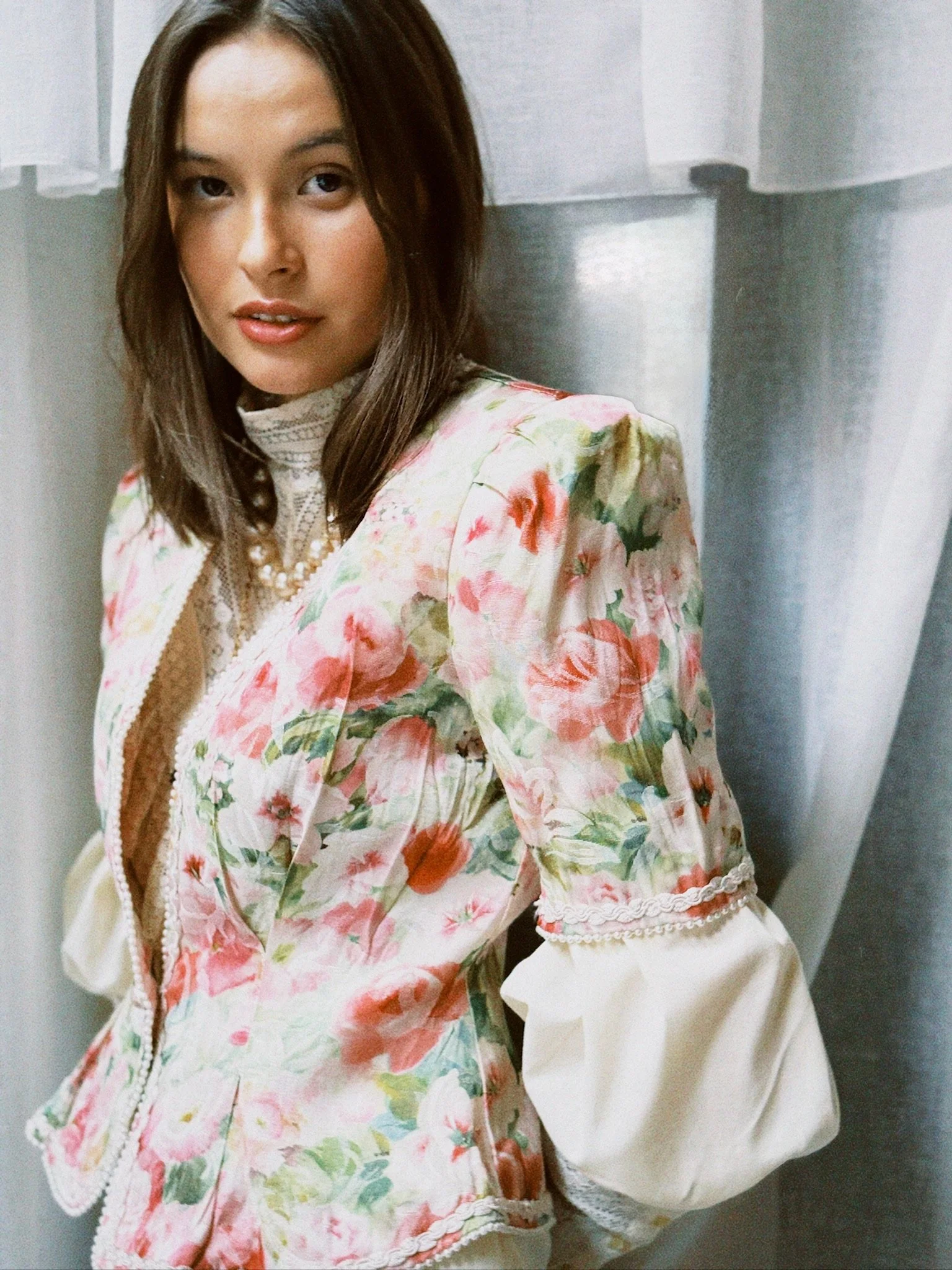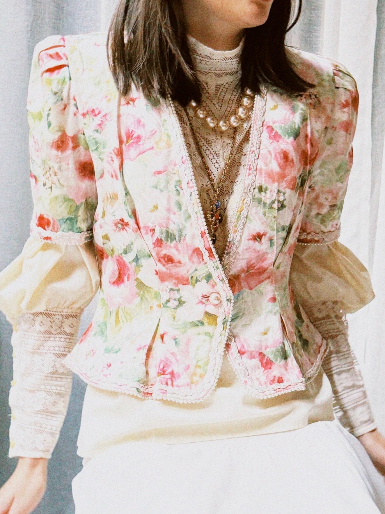 Hello beautiful. Super lekker vintage bluse. Denne er aldeles nydelig. Kort silhuett med innsvinget midje. Hvit bunn med delikat rosé mønster. Kneppes med en stor perle knapp i front. Dette gir toppen en ultimat feminin touch. Store skulder puter for power shoulders. Perfekt å style opp og ned. Kul til jeans eller en lys slacks. Lekker over ett taft/tyll skjørt for en «wurhering hugs» look & feel. Romantisk og effortless cool på samme tid. Flamboyant og helt til å spise opp.